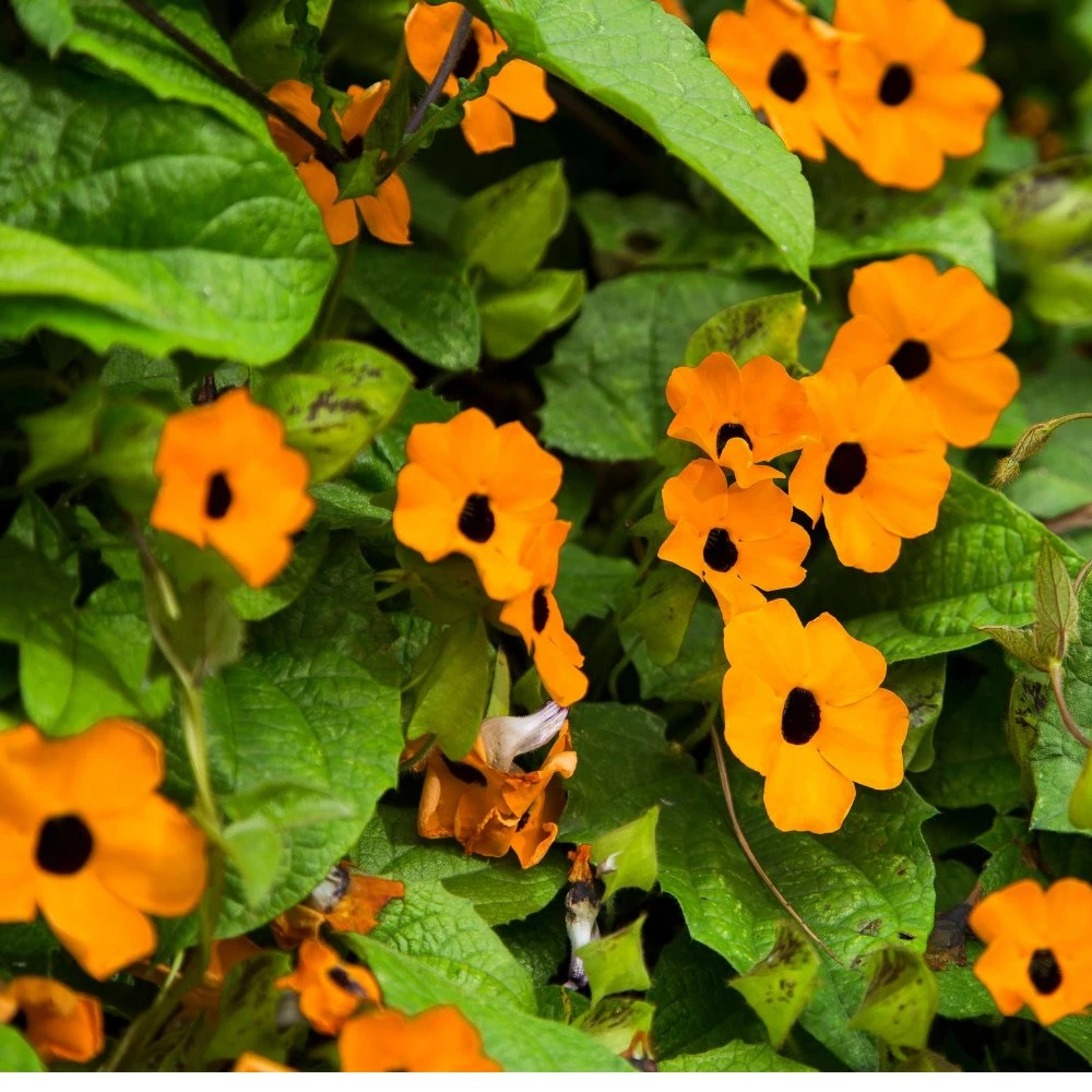 Sunrise Orange Thunbergia is a brightly flowered vine that features deep orange blooms with unique brown eyes. As a twirling and twining vine, it does best with some structure, like a trellis, as it can quickly take over the area. Commonly called Black-eyed Susan Vine, its perfect for your hanging baskets, adding vertical interest or even as ground cover!